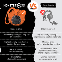 Engineered with Monster K9’s proprietary natural rubber compound, this toy is puncture-, tear-, and chew-resistant, yet flexible enough to remain safe on teeth and gums. The solid, heavy-duty design is rigorously lab-tested to exceed the durability of other tough-chewer brands—built to be as strong as physically possible.